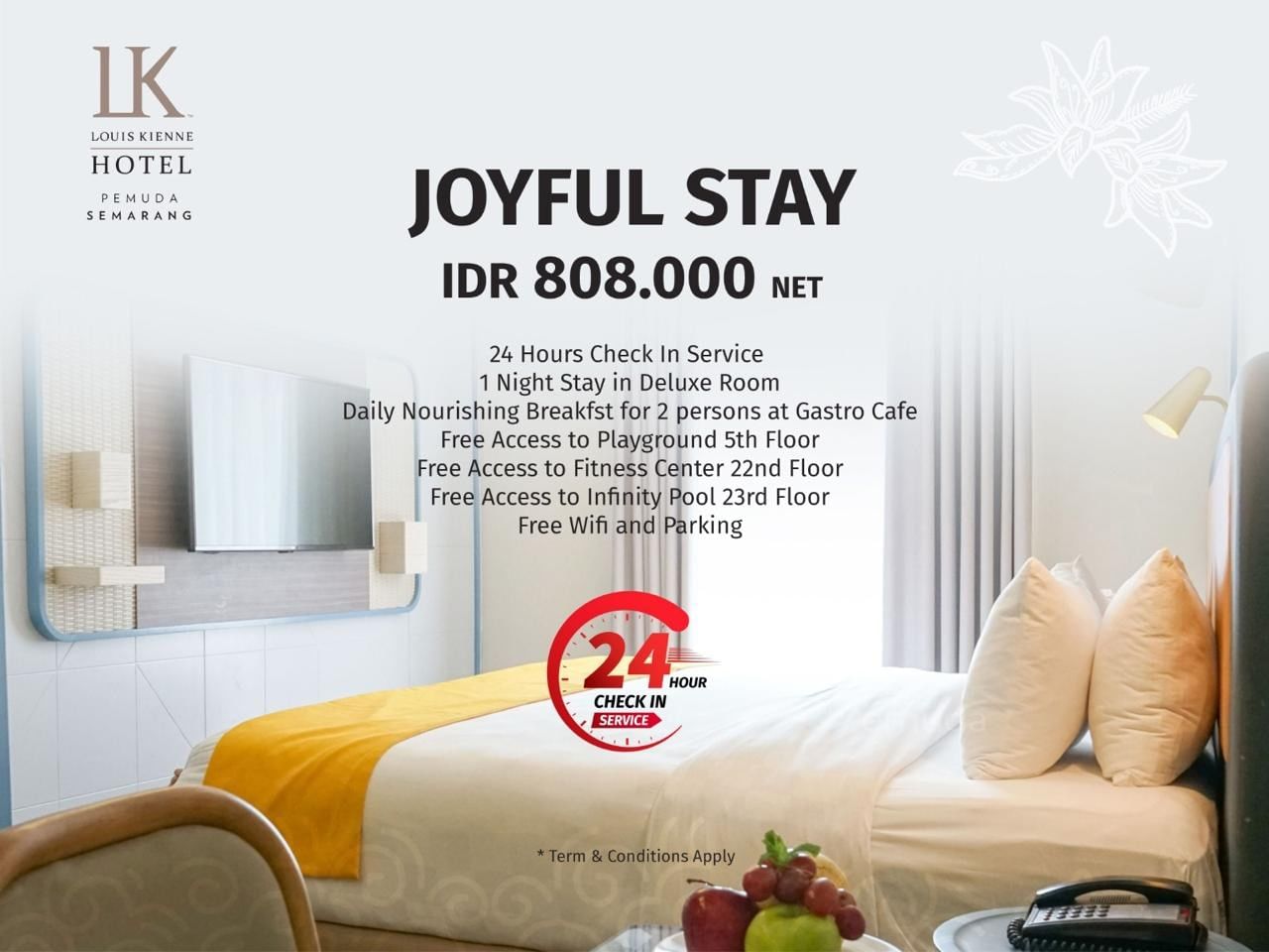 With a size of 28 sqm, our modern deluxe rooms are equipped with facilities such as a Smart TV with local and International channels, work desks, and Super High-Speed internet connections